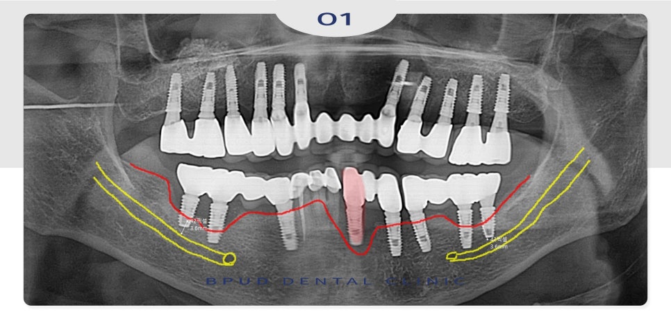신경관 앞쪽으로 4개의 임플란트를 식립하여